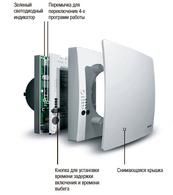 Особенность устройства заключается в возможности его эксплуатации с двойным выключателем (опционально) в двух режимах (производительность – 78 м³/ч либо 92 м³/ч). Без двойного выключателя вентилятор будет работать только в одном из двух вариантов. Для двойного выключателя используется кабель 5х1,5 мм², для одинарного – 3х1,5 мм².